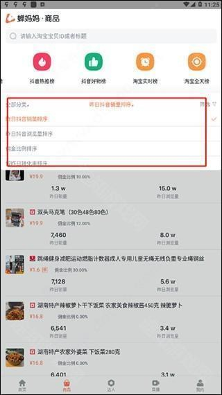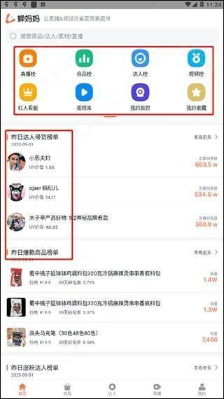 1、打开软件,就能看到商品榜单、达人榜单、抖音直播实时榜单等各类数据。