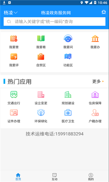“稷事通”的主体框架由“首页”“互动”“我的”三个页面组成。首页涵盖热门应用事项、我要查、我要办、我要评等模块;互动页面整合了咨询、投诉、建议、评价四项功能;“我的”页面以个人信息管理为核心,包含修改密码等设置,以及办件、咨询、投诉与评价等内容的查询功能。