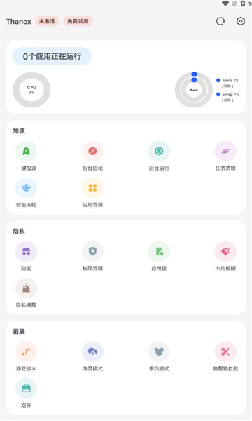1、接着进入Thanox权限管理软件。在正式踏入该软件前,我们有必要知晓软件大致的功能模式。其中,首当其冲的便是激活模式,毕竟不同模式下,用户能够探索到的功能存在差异。