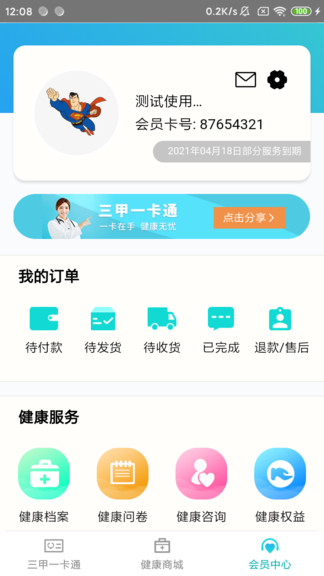 会员中心管理划分了多种版块,涵盖我的订单、健康服务、常用工具等内容。