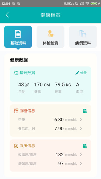 展示丰富多元的健康档案信息,在该档案页面里呈现了基础资料、体检检测结果以及病例资料等内容。