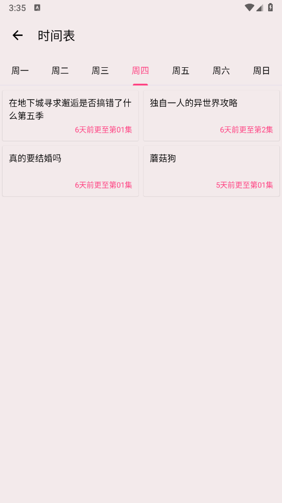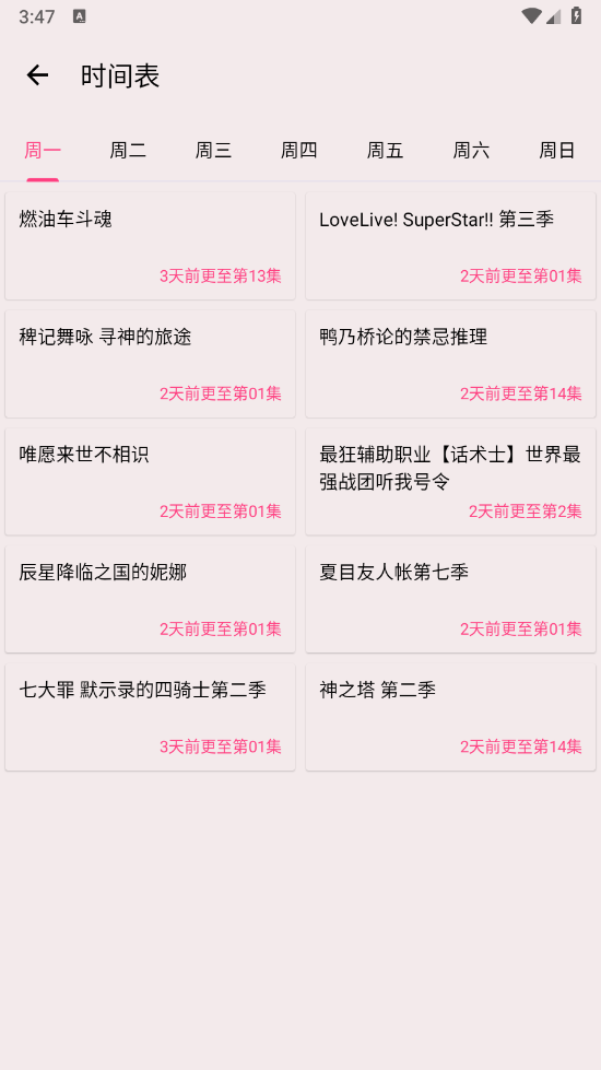 2、“新番时间表”页面会为漫迷们呈现一周内每日的动漫更新信息。
