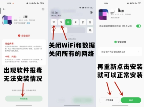 软件安装时若出现报毒提示且没有安装按钮,开启飞行模式或断开网络后重新安装就能解决!