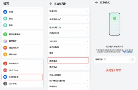 华为鸿蒙系统要关闭纯净模式并断网安装,其他系统大多可在手机管家内进行相关设置。