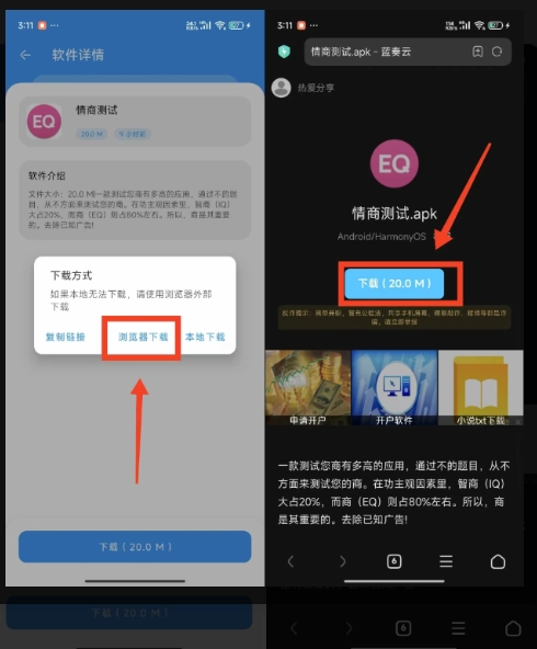 由于部分机型会将淘应用判定为风险软件并强制禁止安装,遇到这种情况时,点击安装链接时可选择通过浏览器打开;需要注意的是,在浏览器中操作时要点击“普通”或“源文件”选项,否则