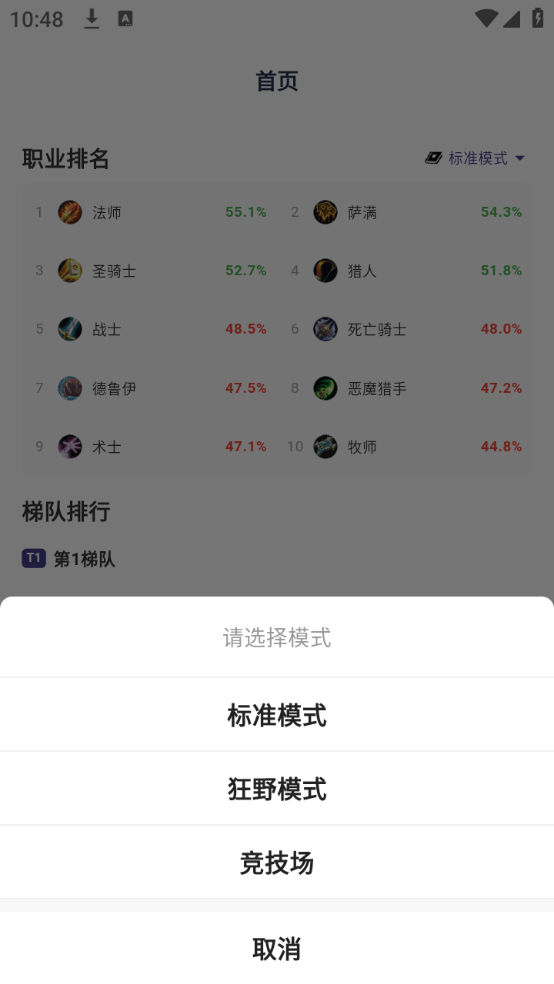 2、首页为玩家呈现了职业排名与梯队排行信息,玩家可依据自身需求选择标准模式、狂野模式或竞技场模式。