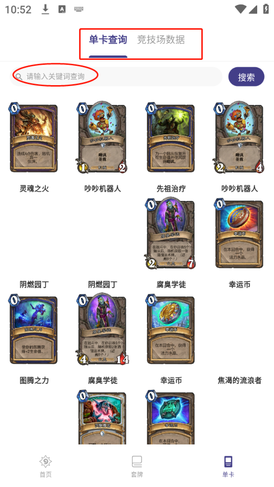 4、在“单卡”功能页面,用户点击进入单卡界面后,能够在线查询单卡信息,搜索查看竞技场相关数据,还可以通过关键词来进行查找操作。