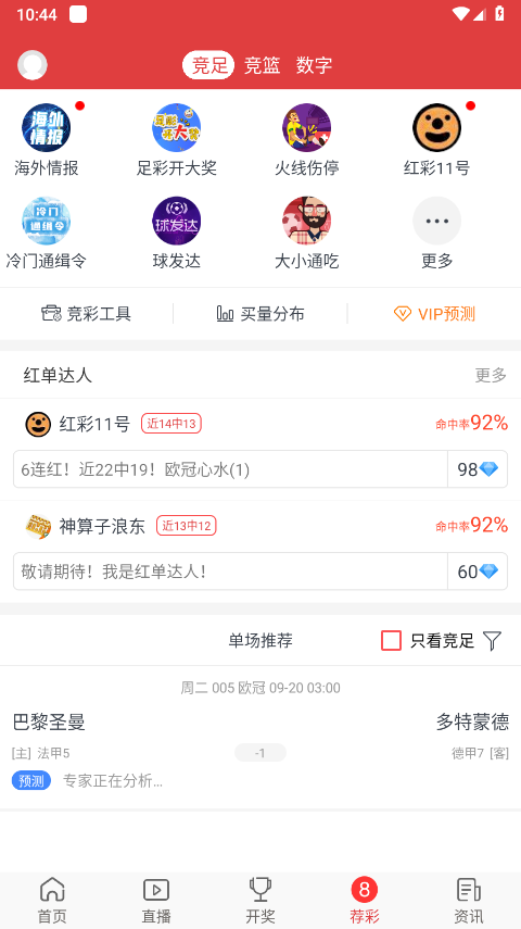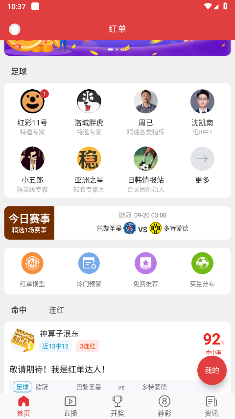 打开后直接进入主页,主页顶部就能看到足球情报专家的相关内容以及今日的赛事信息。