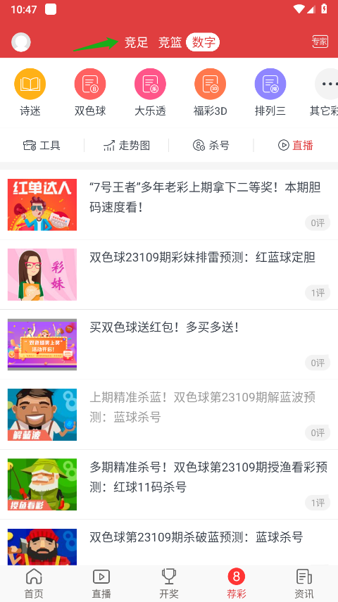 2、进入荐彩页面,选择“竞足”选项。