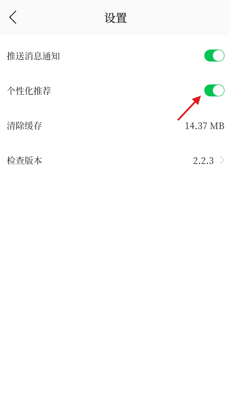 3、在系统设置界面内,找到 “个性化推荐” 功能开关,点击将其关闭即可完成操作。