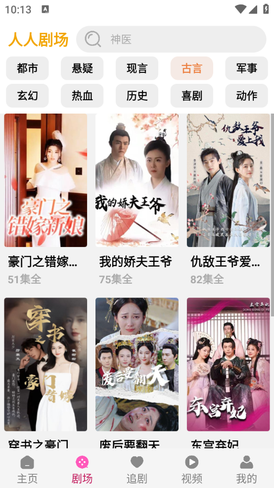 2、“剧场”页面设有详细的短剧分类,涵盖言情、悬疑、古言等多种类型。