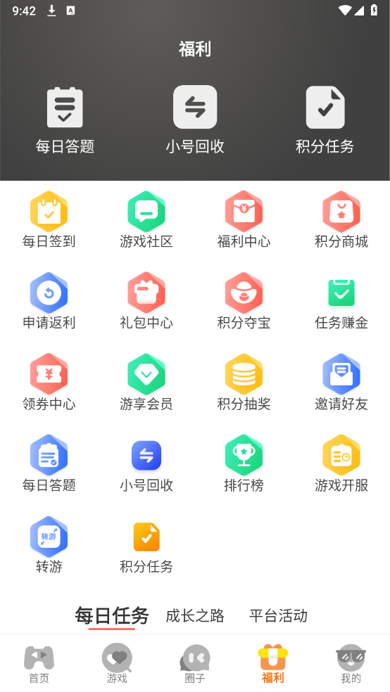 6、点击“福利”,可以通过完成呢过每天的任务获得福利哦。