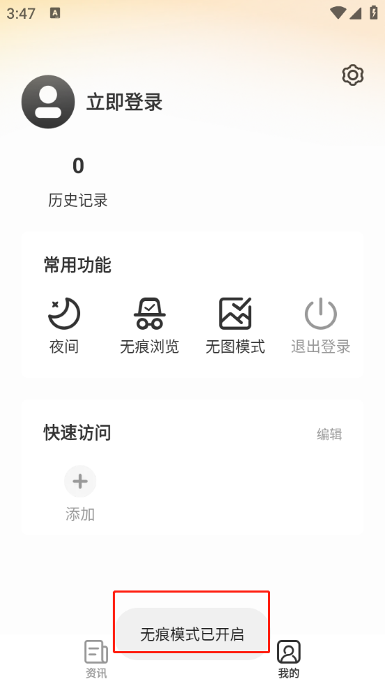 3、提示“无痕模式已开启”即可,接下来便是无痕搜索。