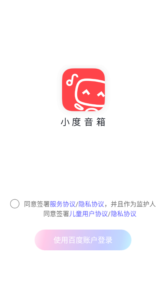 1、在本站完成操作并将应用安装到小度音箱后,进入小度音响的开始页面,同意相关协议,然后点击使用百度账号进行登录。