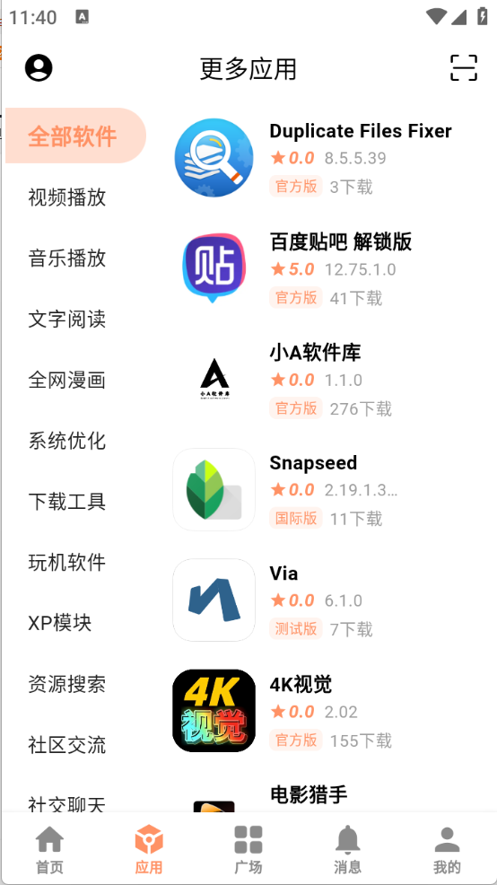 3、“应用”板块对应用做了细致划分,涵盖视频类、音乐类、漫画类等类别。