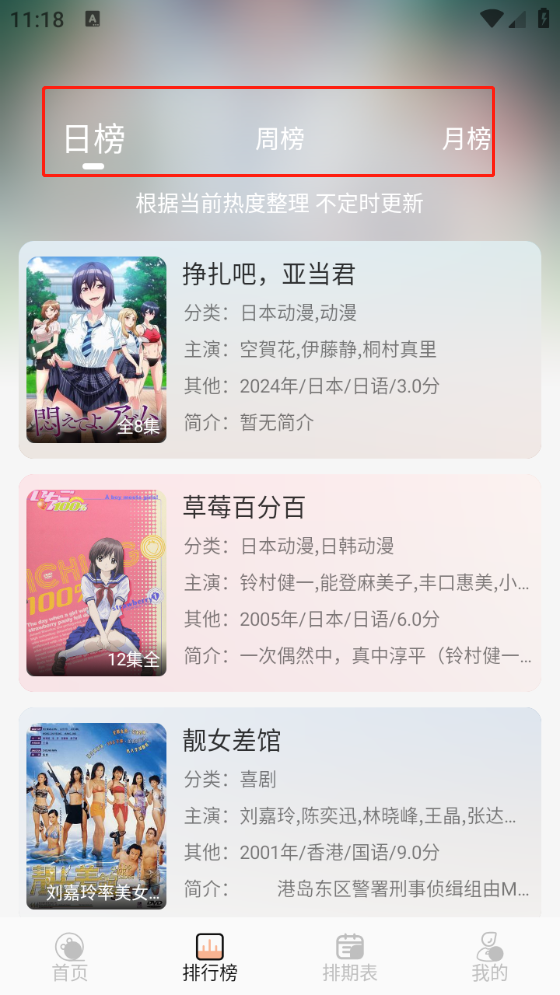 4、排行榜板块有日榜、周榜以及月榜,帮助用户及时发现当下火爆的动漫资源。