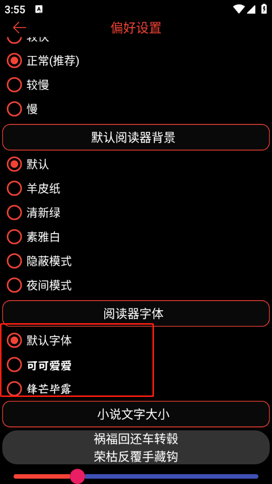 2、在“阅读器字体”页面选择要更改的样式即可。