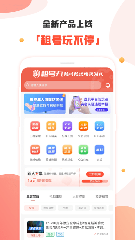 《租号社》是一款专业的账号出租平台,设有丰富的分类专区。用户可以在这里挑选心仪的账号,无论是热门游戏账号,还是满级、皮肤齐全的优质账号,都能轻松找到并自由使用,助力玩家获得更畅快的游戏体验。平台操作便捷流畅,力求为用户带来舒心的使用感受。