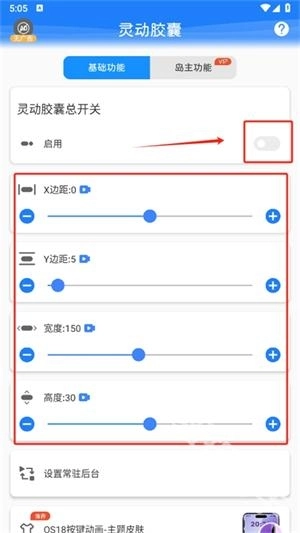 3、完成上述操作后进入主页,开启灵动胶囊的总开关,随后可根据自身需求对灵动胶囊的边距、宽度等参数进行设置。