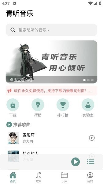 青听音乐2025版是一款永久免费的音乐软件。这款软件中的音乐全都可以免费听、免费,而且可以收听无损音质版本。软件内各类音乐齐全,且已为用户分类好,用户可以快速查看并在线收听。喜欢听歌的朋友一定要来看看。