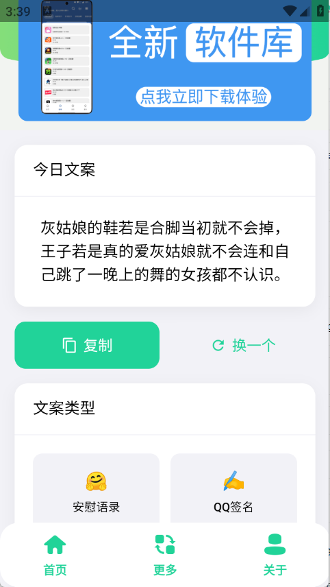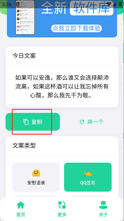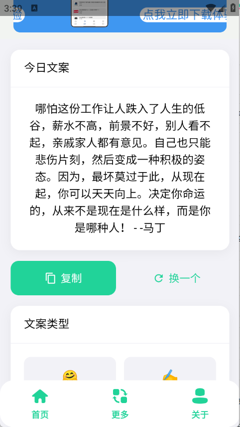 聚合文案库,可以一键生成相关的文案,不管是个性签名、毒鸡汤还是名言警句等都有,可以将生成的文案素材进行复制整理,及时更新新的资源内容2,无需注册登录,用户可以轻松上手进行使用。