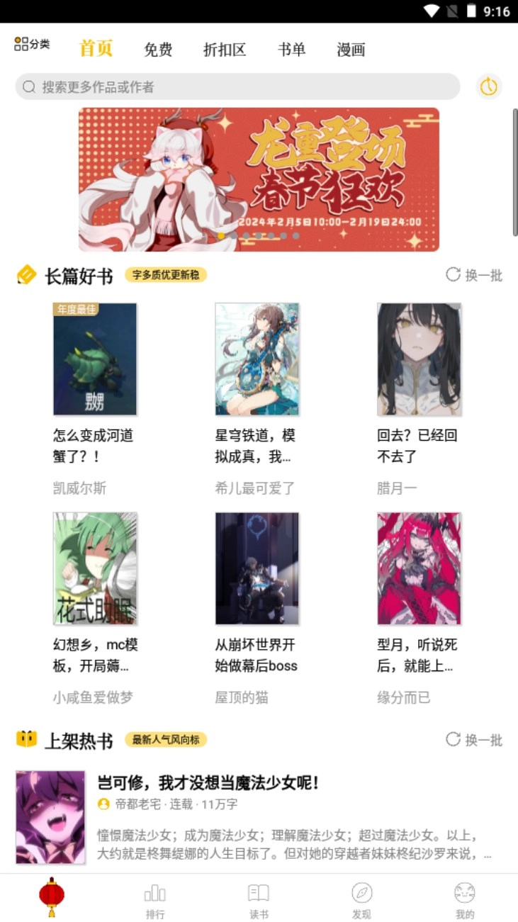 在首页,插画区可能位于【发现】区域,或者通过点击【书架】进入【阅读书籍】,再点击【全屏】按钮切换到插画区