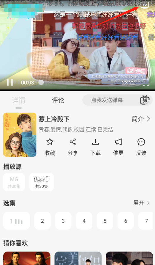 用户点击进入想观看影片的播放页面后,点击右上角的“TV”按钮。