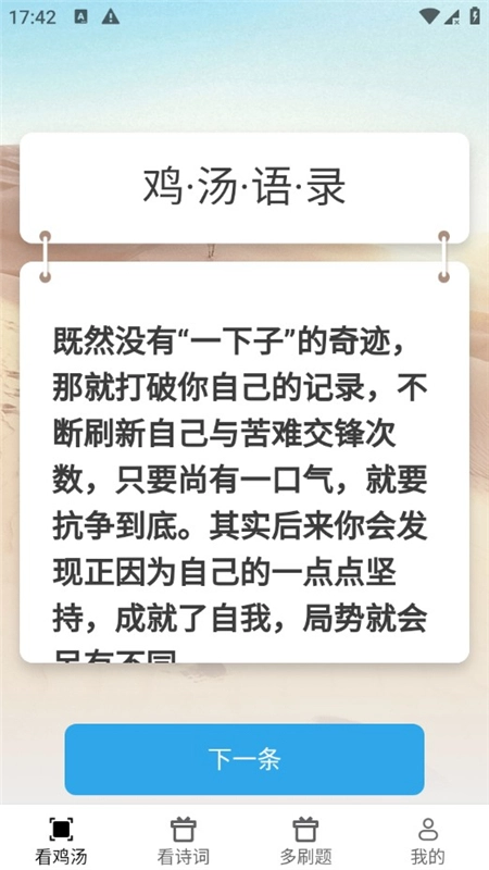 2.在这里,你可以通过每天的励志语录汲取力量,通过古诗词感受中华文化的博大精深,通过刷题提升自己的学业成绩。