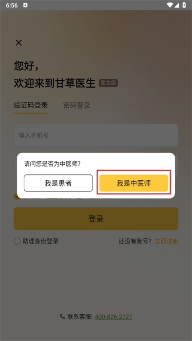 此时会弹出一个提示窗口,询问用户身份是患者还是医生,需点击【医生】按钮。