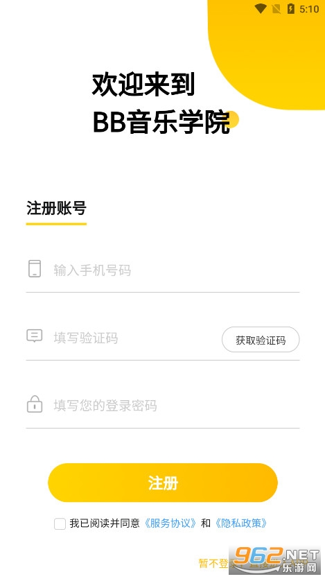 点击注册按钮,进入BB音乐学院的账号注册界面,通过手机号接收验证码并填写的方式来完成注册流程。