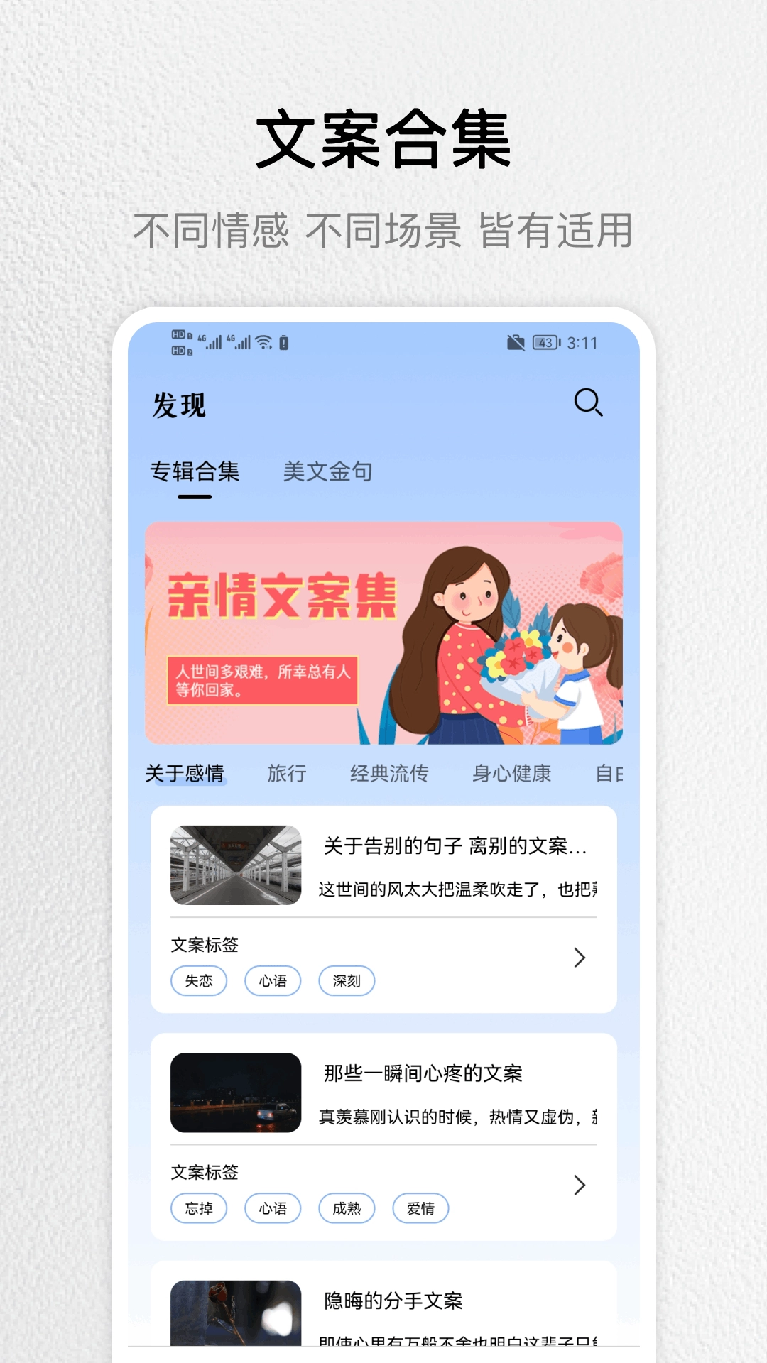 3.文案馆免费版界面、无弹窗干扰,让用户能专注感受文字之美,适合碎片化时间品读文案。