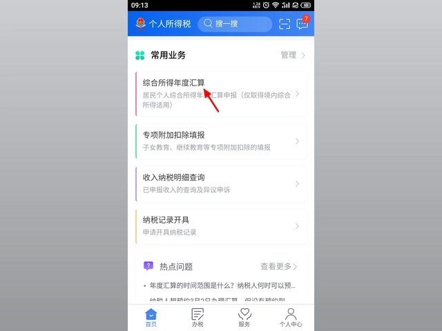个人所得税申请退税的具体操作步骤如下: 1、打开个人所得税APP首页,找到并点击“综合所得年度汇算”选项。
