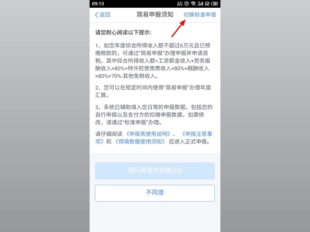 2、进入选择申报年度的页面后,选定2022年度。 3、查看简易申报须知后,点击“切换标准申报”按钮。