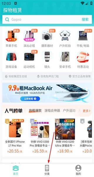 1、打开软件后,进入首页,看到各类租赁设备分类,点击分类选项,进入分类筛选页面。