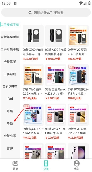 2、进入分类页面,浏览设备分类列表,选择华硕分类,进入华硕设备的租赁列表页面。