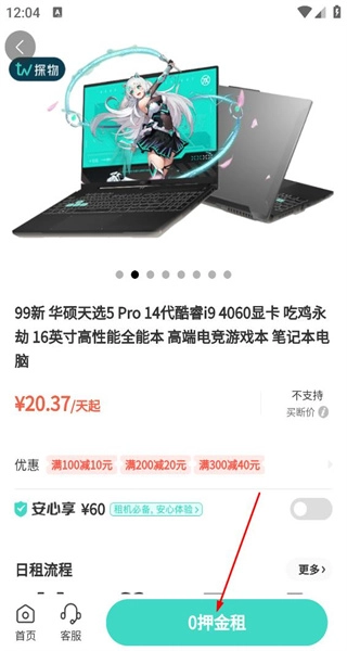 4、进入设备详情页,查看价格及优惠信息,点击0押金租按钮,即可发起该设备的租赁流程。