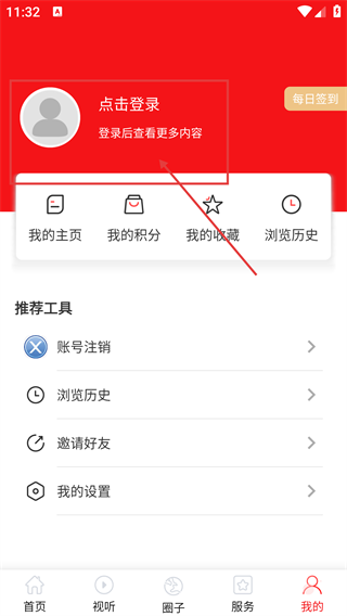 2、在个人中心页面,点击【点击登录】区域,进入用户登录页面,登录后可查看更多内容及功能。