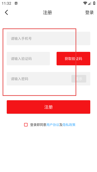 4、在注册页面,依次填写【请输入手机号】-【请输入验证码】-【请输入密码】,点击【注册】按钮。