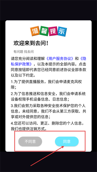 1、进入【去问】后,仔细阅读【用户服务协议】、【隐私保护政策】以及温馨提示的相关内容,随后点击【同意】按钮,即可进入到后续的页面。