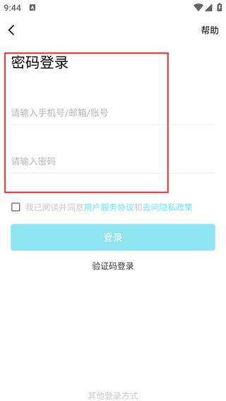 3、切换至【密码登录】界面,输入【手机号/邮箱/账号】与【密码】,勾选相关协议后,点击【登录】按钮完成操作。