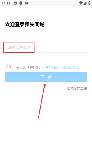 2、在验证码登录界面输入手机号,勾选协议后点击【下一步】按钮,进入验证码填写页面。