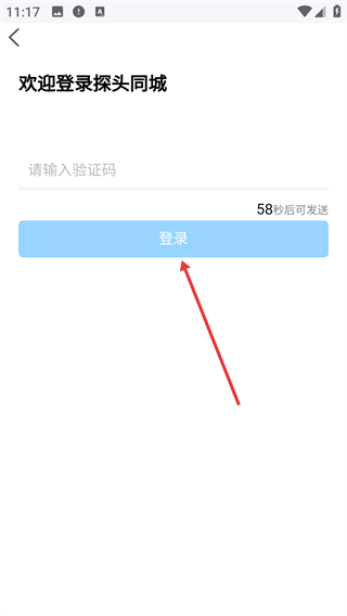 3、在验证码填写页输入收到的验证码,点击【登录】按钮,完成“探头同城”的账号登录操作。
