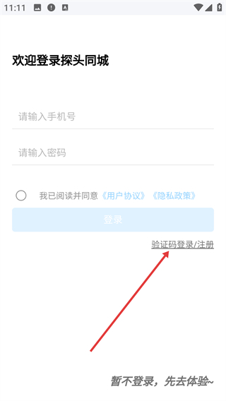 1、在“探头同城”登录页点击【验证码登录/注册】选项,切换至验证码登录的操作界面。