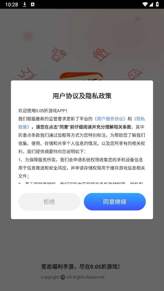 1、安装0.05折游戏,同意相关的政策与协议之后进入软件。