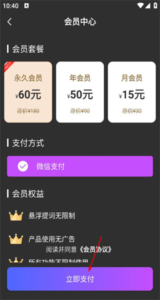 4、登录后回到个人中心,进入会员中心页,选择会员套餐后,点击立即支付按钮,推进开通流程。