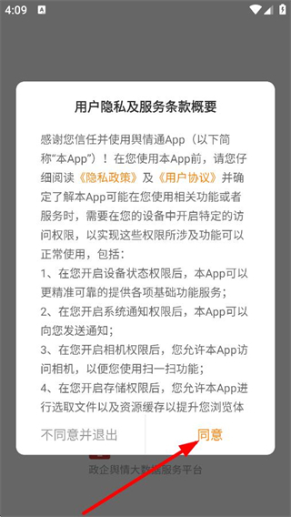 1. 在弹出的用户隐私及服务条款概要窗口内,点击“同意”选项,随即进入登录页面。