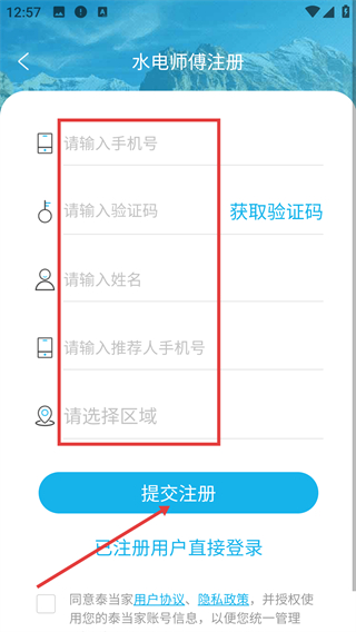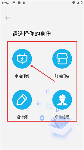 2、在身份选择界面点击【水电师傅】选项,进入水电师傅的注册信息填写页面。