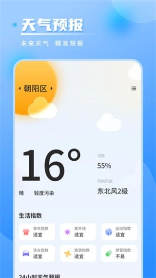 4、提供实时天气查询,包括温度、湿度、风向风速、污染情况,还有未来天气精准预报。