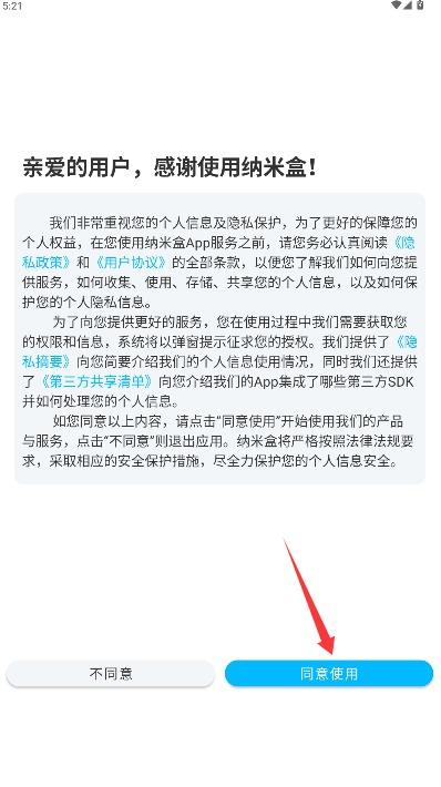 1、首次使用需仔细阅读用户协议及隐私政策,确认后点击同意使用进入登录界面。