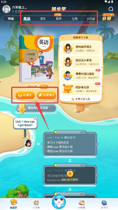 4、选择具体科目后即可使用听课文或点读功能,支持语音跟读与互动学习。